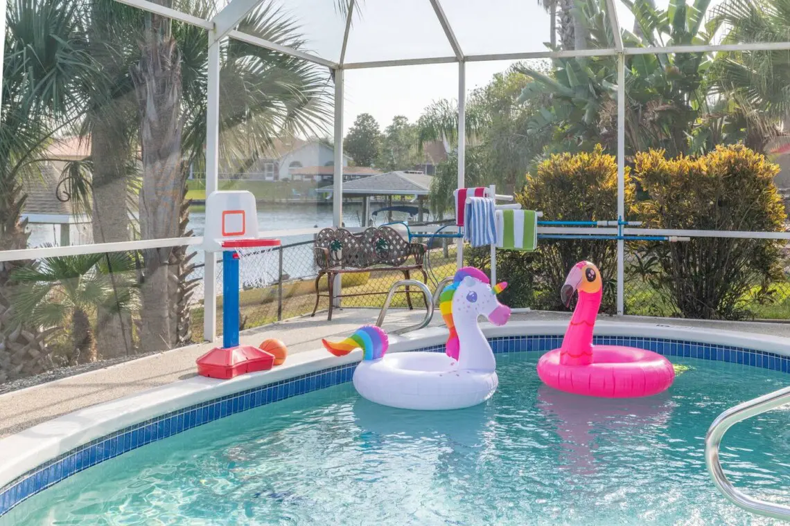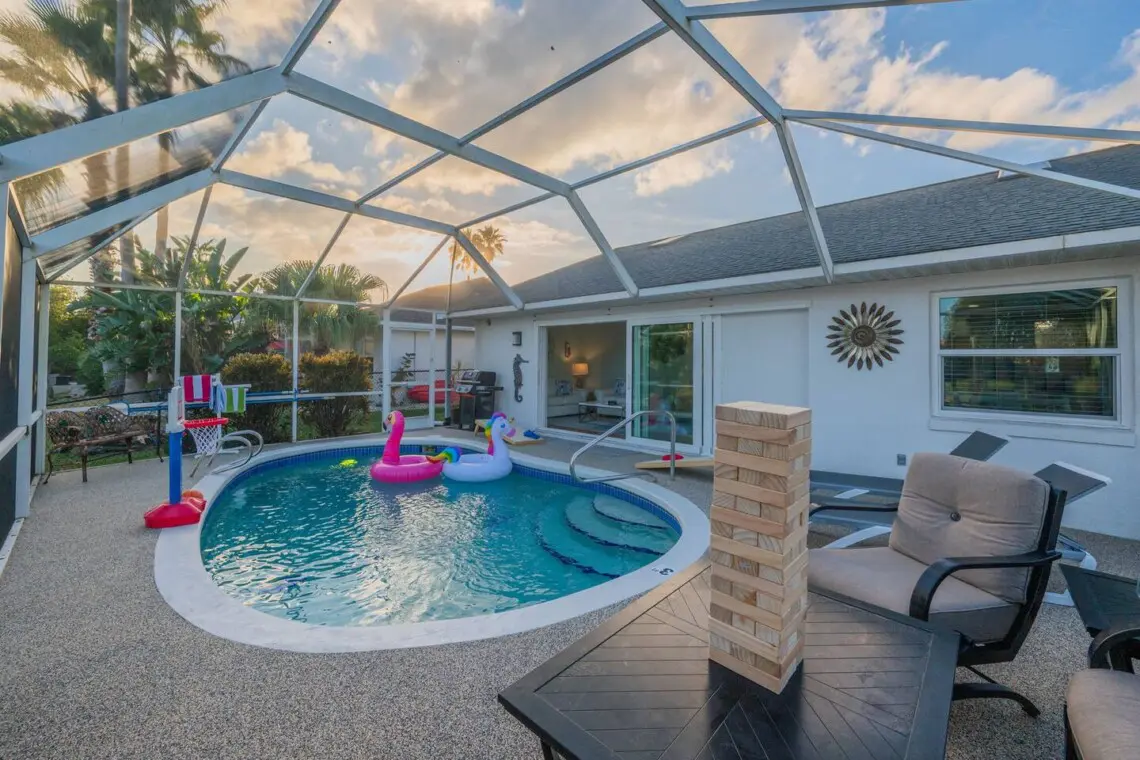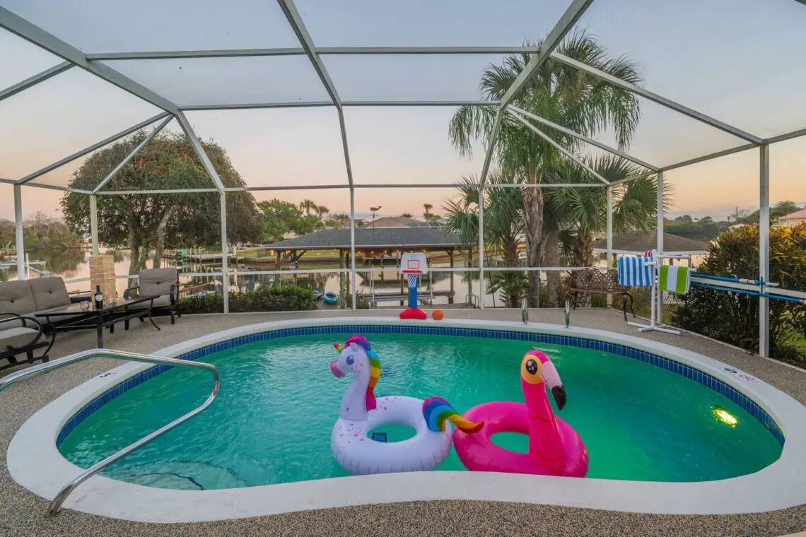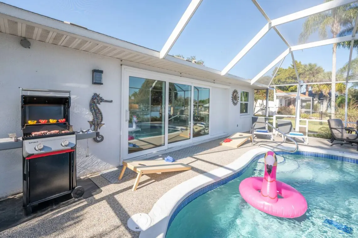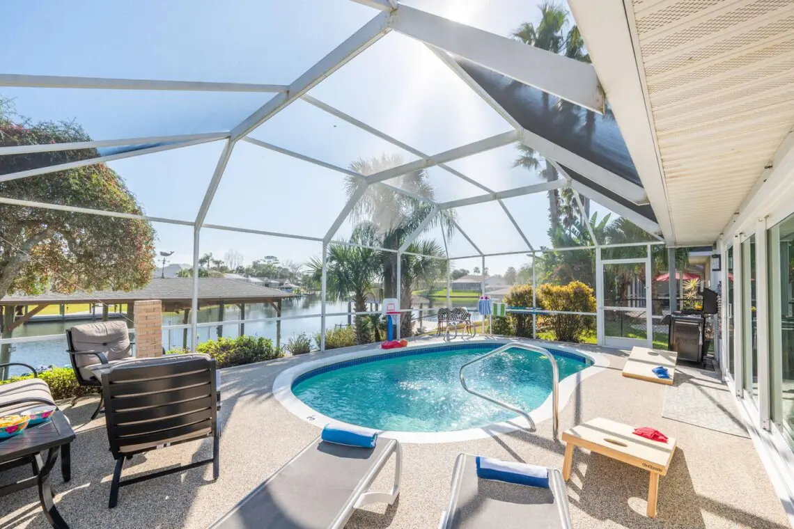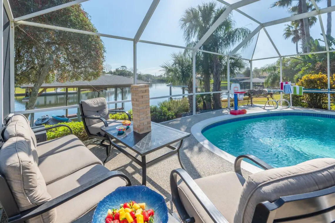 🏊♂️ Outdoor seating by the heated pool overlooking the canal